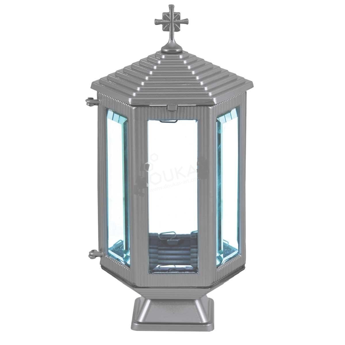 Καντήλι Μνήματος Εξάγωνο Με Τζάμι Κρύσταλλο Ελληνικής Κατασκευής Από Χυτό Αλουμίνιο. Διαστάσεις 16cm*32cm Ύψος