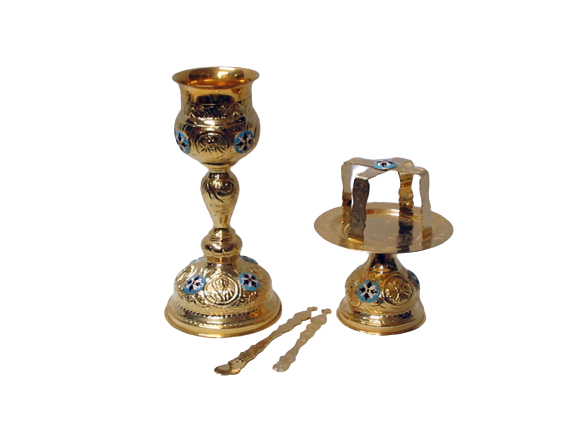 Σέτ Δισκοπότηρο Ελληνικής Κατασκευής με Ροζέτα Σμάλτου Σκαλιστό Χάλκινο Επιχρυσωμένο & Δουλεμένο στο Χέρι