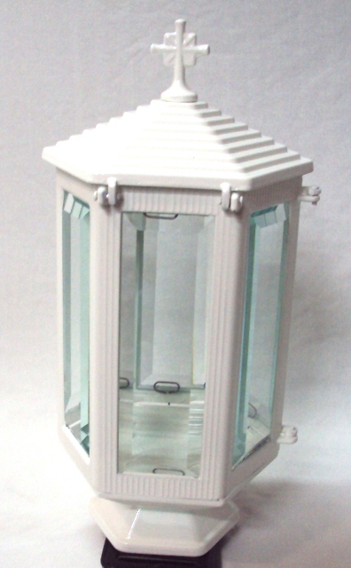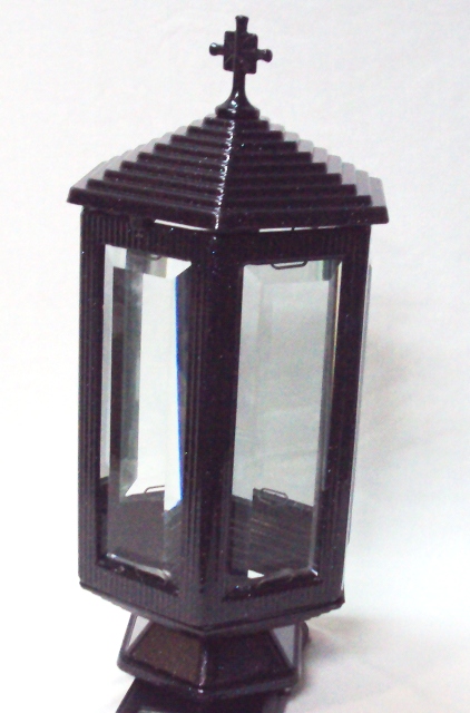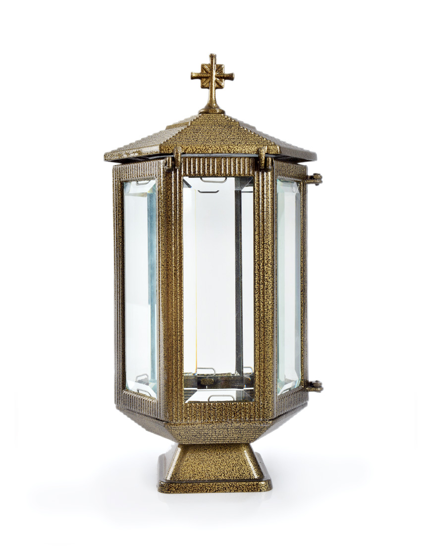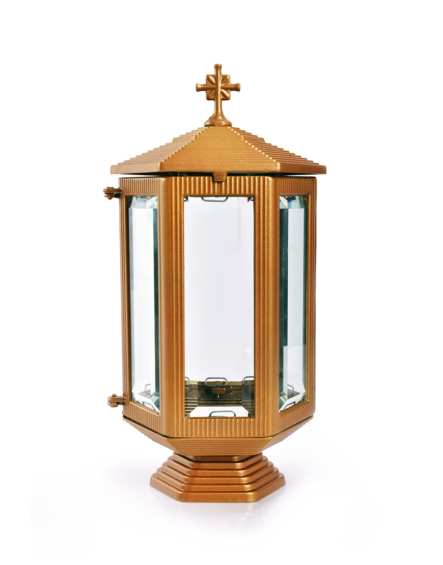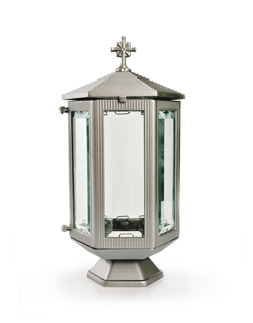 Καντήλι Μνήματος Εξάγωνο Με Τζάμι Μπιζουτέ Ελληνικής Κατασκευής Από Χυτό Αλουμίνιο. Διαστάσεις 14cm*32cm Ύψος
