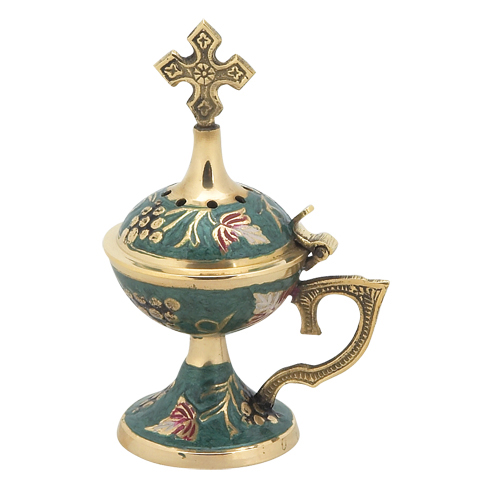 Λιβανιστήρι Ορειχάλκινο Ιδιαίτερης Αισθητικής Με Επίστρωση Πράσινου Σμάλτου Και Απεικονίσεις Λουλουδιών. Ιδανικό Για Το Σπίτι Και Τα Μνήματα. Διαστάσεις 13 cm Ύψος Εισαγώμενο Προϊόν